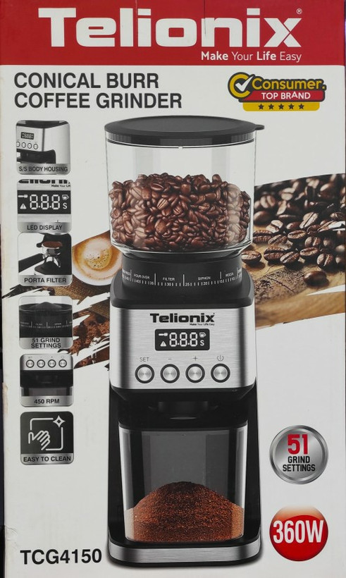 مصرفی 360وات جنس بدنه استیل ضد زنگ رنگ بدنه نقره ای از دیگر خصوصیات این دستگاه مخزن ۲۵۰ گرمی و جنس بدنه ، صفحه برد و دکمه های استیل ، نمایشگر LED، لرزشگیر قوی ، صدای بسیار کم میتوان نام برد. لوازم جانبی مانند فرچه برای تمیزکاری آسیاب و مخزن قهوه ی آسیاب شده ونگهدارنده مگنتی(آهنربایی) پرتافیلتر برای سایز ۵۱ و ۵۸ همراه دستگاه موجود است