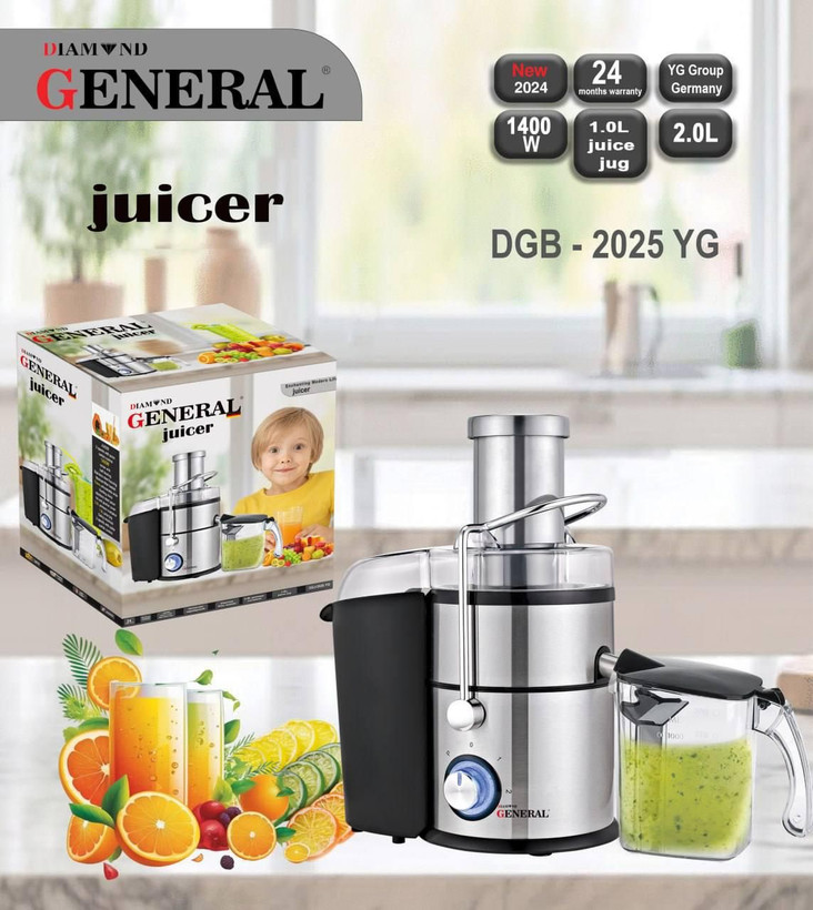 آبمیوه گیری جنرال تک کاره بوده و دارای موتور بلبرینگی با توان 1400 وات است. این محصول یک پارچ درب دار دارد که آب میوه ها درون آن سرازیر می شود.