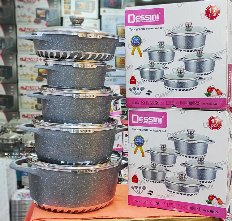 قابلمه دسینی از کیفیت و قیمت قابل قبولی برخوردار هستند .این سرویس شامل چهارعدد قابلمه در سایزهایمختلف سایزقابلمهها32.28.26.20و یک عدد ماهیتابه به سایز28 میباشد.این قابلمه ها دارای پوشش رویی گرانیتوهمچنین شیشه سری قابلمه از شیشه حرارت دیده و بسیار مقاوم است. کفقابلمهدارایشعله پخشکنطراحی شده کهدر این قابلمه باعث میشود که گرما به طور مساوی در پخش شود و انرژی کمتری برای پخت و پز شما استفاده شود. در ساخت این قابلمه دارای استانداردمیباشد به این معنی که از مواد شیمیایی در ساخت این محصول استفاده نشده و کاملا سالم است.